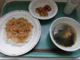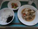 今日の給食は、マーボー白菜丼、牛乳、わかめと豆腐のスープ、お豆かりんとうです。 ...