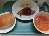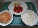 今日の給食は、セサミパン、牛乳、鶏肉のトマト煮、リエージュ風サラダ、ワーテルゾー...