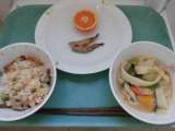 今日の給食は、鶏おこわ、牛乳、わかさぎのからあげ、かぼちゃのほうとう、みかんです...