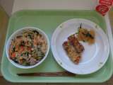 【献立】 有機米ごはん 牛乳 あんかけ汁 鮭の塩麹焼き じゃがいものきんぴら炒め...