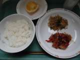 今日の給食は、麦ご飯、家常豆腐、茎わかめのナムル、みかんです。 今日の給食食...