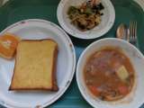 今日の給食は、フレンチトースト、牛乳、海藻サラダ、豆入りポークシチュー、いよかん...