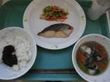 今日の給食は、玄米ご飯、牛乳、のりの佃煮、サワラの味噌麹焼き、野菜の辛子和え、け...