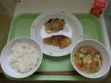 【献立】 ごはん 牛乳 わかめスープ ヤンニョムチキン チャプチェ 今日は...