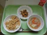 【献立】 高野豆腐のそぼろ丼 牛乳 利休汁 大豆と小魚の甘辛揚げ 【今日の...