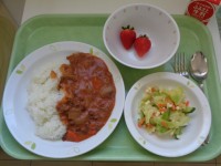 【献立】ハヤシライス牛乳チーズ入りフレンチサラダいちごいちごの品種は「とちあいか...