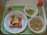 【献立】ピザトースト牛乳ABCマカロニスープツナサラダカフェオレゼリー【今日の給...