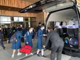 新幹線は定刻運行。17時06分に新横浜に到着予定です。どの子の鞄もお土産でバン...