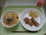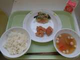 【献立】 鯛めし 牛乳 あられ麩のすまし汁 鶏のから揚げ 小松菜入り春雨サラダ ...