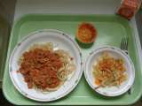 【献立】 スパゲッティミートソース 牛乳 じゃがいものハニーサラダ チーズケーキ...