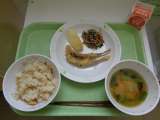 【献立】 玄米ごはん 牛乳 のりの佃煮 吉野汁 鰆のカレー麹焼き ひじきと大豆の...