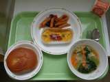 【献立】 黒砂糖パン 牛乳 白いんげん豆のスープ チーズ入り卵焼き ラタトゥイユ...