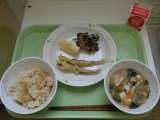 【献立】 たけのこごはん 牛乳 吉野汁 ししゃもの天ぷら 磯辺和え りんご ...