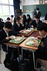 真は3年生の給食の風景。班で向かい合って食べる給食は久しぶりです。楽しさは、食...