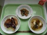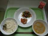 【献立】 玄米ごはん じゃことわかめのふりかけ 牛乳 呉汁 鶏肉のピリ辛焼き 野...