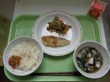 【献立】 玄米ごはん 大豆みそ 牛乳 けんちん汁 白身魚のあずま煮 もやしとわか...