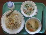 6月の給食を紹介します。 左が22日(水)ナシゴレン、チーズのふわふわスープ、魚...