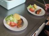 調理実習、2年生は「ムニエル」 トマト、ジャガイモは学校の近所の方が育てたもので...