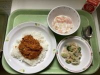 カレー、サラダ、牛乳、桃ゼリー1番印象的だったのは、食事係さんの丁寧な配膳。細や...