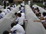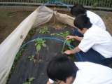今日の内容は、種まき、支柱立て、寒冷紗留めです。 指で土に穴をあけ、1粒ずつ小さ...