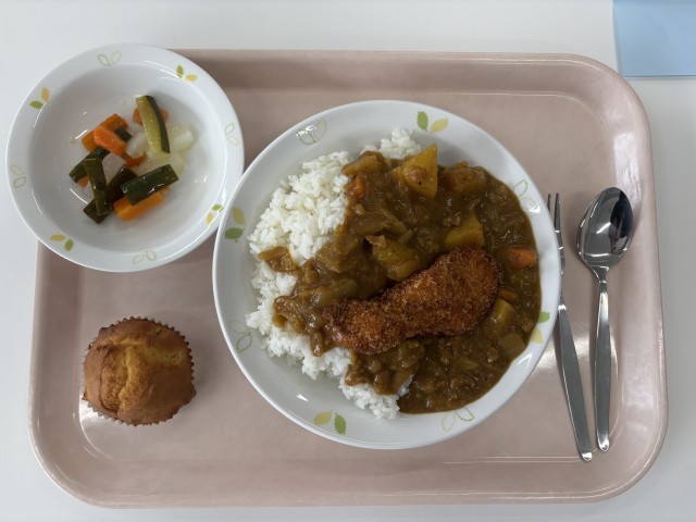 チキンカツカレー🍛、ピクルス、パイナップル🍍ケーキです。