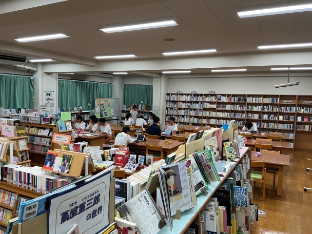 放課後は、本の貸し借りや読書活動以外に、学習センターとしての利用もできます。本日は10人以上の人が学習の場として利用していました。司書が資料提供することが可能ですし、iPadを利用しての調べ学習もできます。