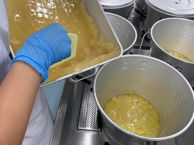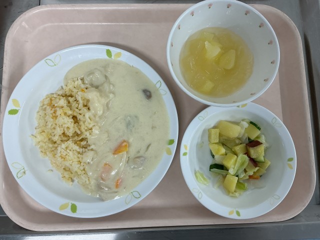 今日のごはんはすりおろしたにんじんを一緒に炊き込んだので、鮮やかなオレンジ色になりました。そのうえに具だくさんのホワイトソースをかけていただく洋風メニューです。アップルポンチは、給食室で作ったりんごゼリーをダイスにカットして、シロップとりんごの缶詰を合わせて作りました。