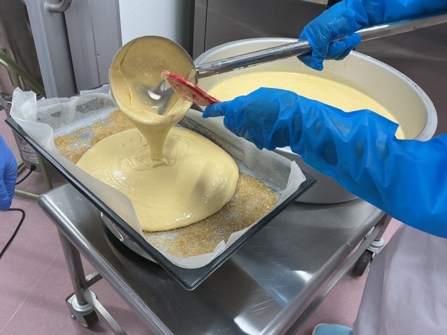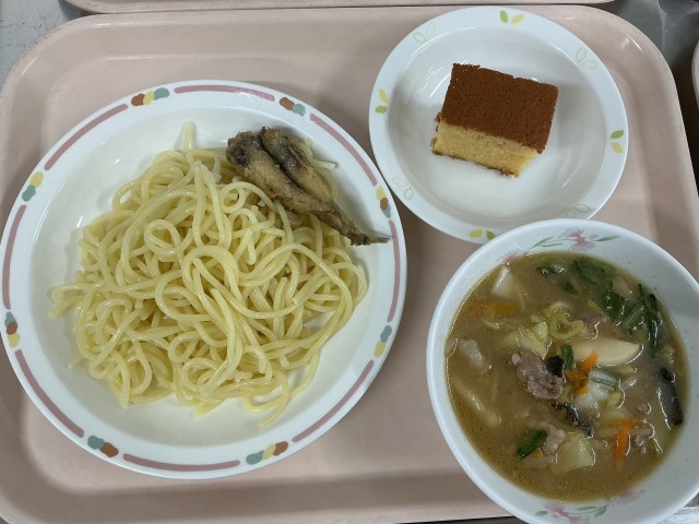 今日の給食は長崎県の郷土料理です。長崎名物「ちゃんぽん」は、いろいろなものを混ぜるという意味で、肉や野菜、魚介などたくさんの具材が入った麺料理です。カステラは、ポルトガルから長崎に伝えられたお菓子です。底にざらめをしき、卵をよく撹拌して作ったのでふんわりと本格的な味わいに仕上がりました。