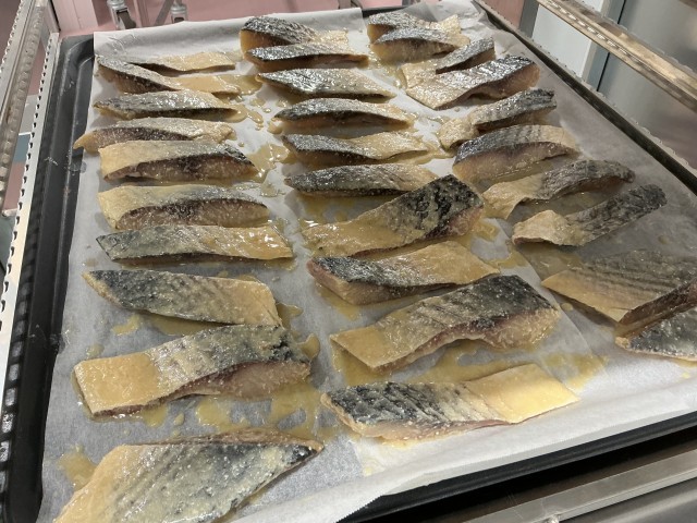 今日の魚は寒ボラです。ボラというと泥臭いイメージがありますが、水質の良い沖合で獲れた魚は臭みが少なく食べやすいです。みそと塩麹を合わせた調味料に漬け込んでオーブンで焼きました。