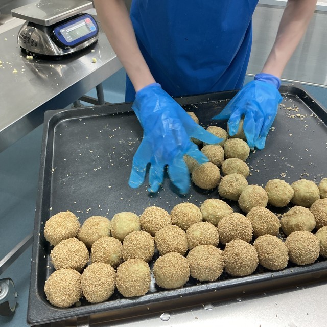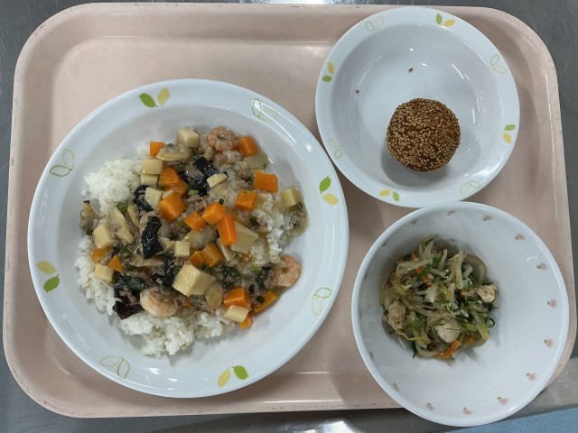 さつまいものごま団子は、中華料理のごま団子のさつまいもを使ったアレンジです。さつまいもに白玉粉を混ぜ込んで作った生地に、ごまをびっしりまぶして油で揚げました。外はカリカリ、中はしっとり仕上がり、どのクラスもほとんど完食となりました。