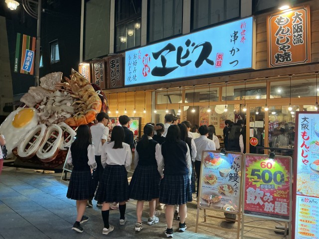 通天閣の近くの店で、大阪グルメを味わいました。揚げたての串カツなど、どれもこれも美味しくてお腹いっぱいになりました。