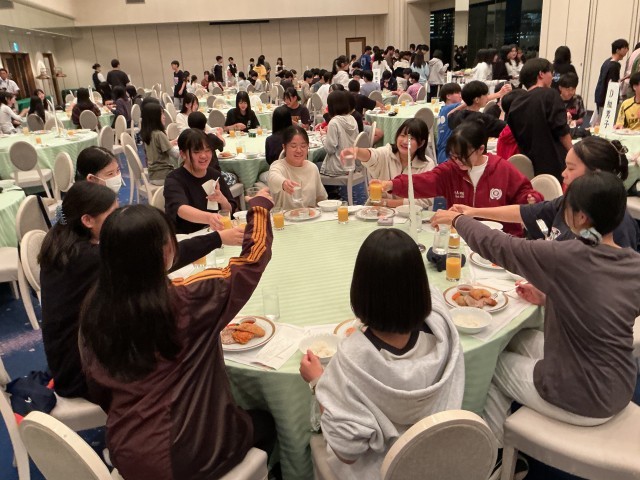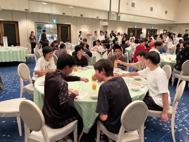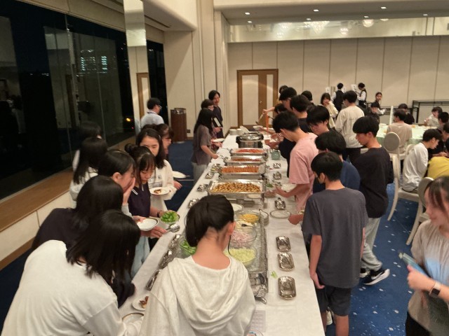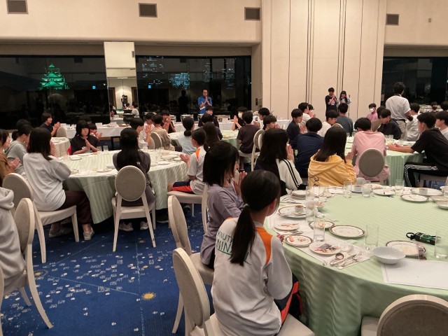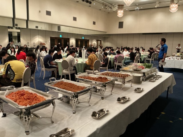 夕食はホテルでブッフェスタイルでいただきました。ステーキや魚のフライ・カツ・お好み焼き・ナポリタンスパゲティ・ハヤシライス・サラダ・フルーツ・ロールケーキなどなど。とても美味しくいただきました。