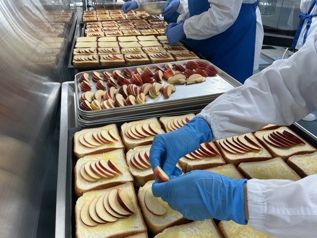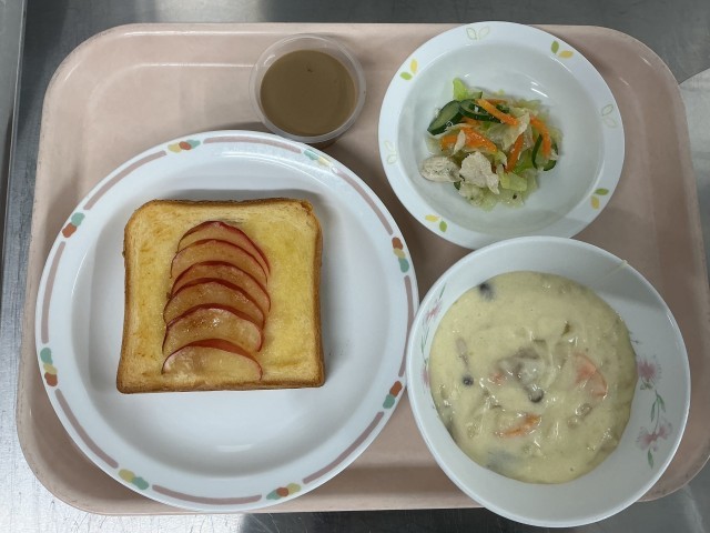 アップルトーストは、バターとはちみつを混ぜたものをパンに塗り、スライスしたりんごをのせてシナモンシュガーをかけ、オーブンで焼いて作りました。りんごは紅玉という品種を使ったので、甘酸っぱい味が口の中に広がりました。