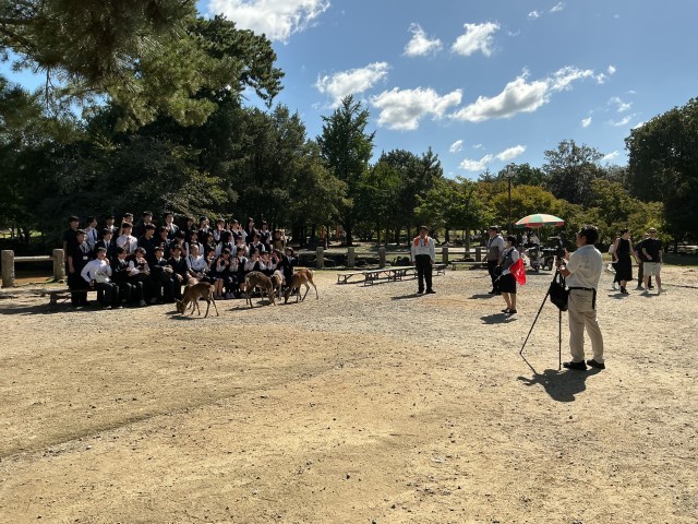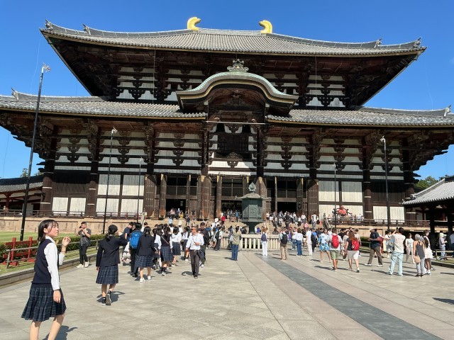 東大寺の大仏殿に入りました。鹿と一緒にクラス写真も撮りました。