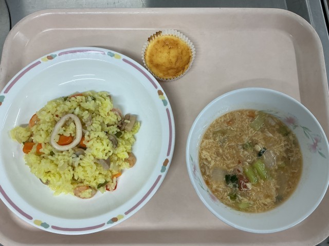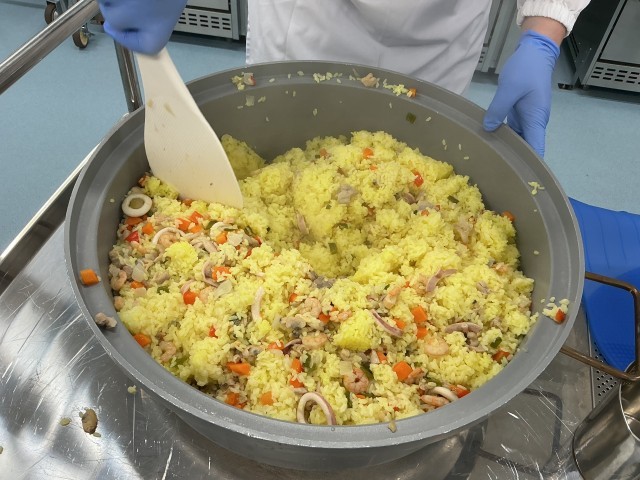 今日はスペイン料理の献立です。パエリアはサフランで黄色と香りをつけて、たっぷりの魚介類を具に混ぜ込みました。ソパ・デ・アホはニンニクを使ったスープです。バスク風チーズケーキは外側を黒く焦がした濃厚な風味のチーズケーキです。チーズケーキはとても好評で、残菜はゼロでした。