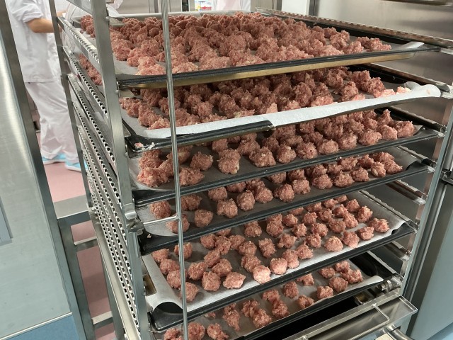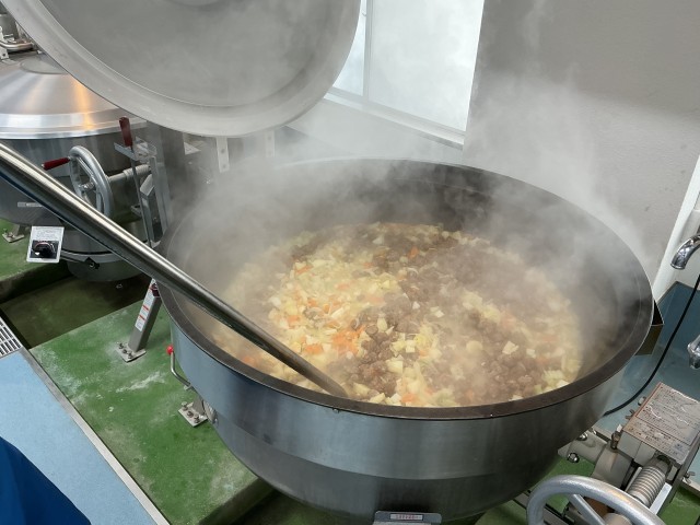 今日のクリーム煮には、給食室で手作りした肉団子が入っています。肉団子にはひき肉の他に、砂肝ミンチや豆腐を使って鉄分をアップさせています。肉団子は一度オーブンで焼いてからクリーム煮に加えました。