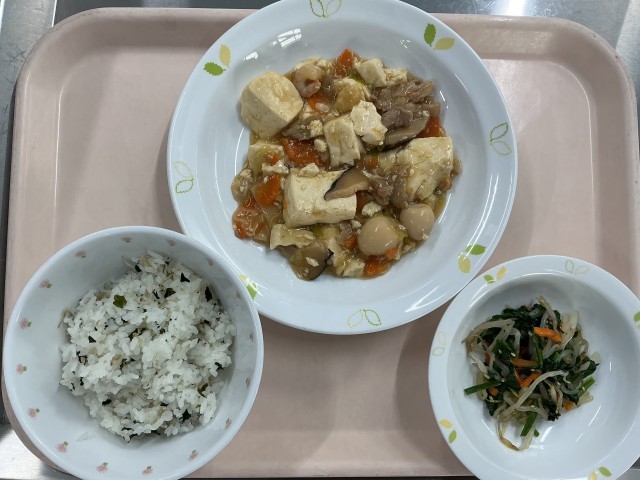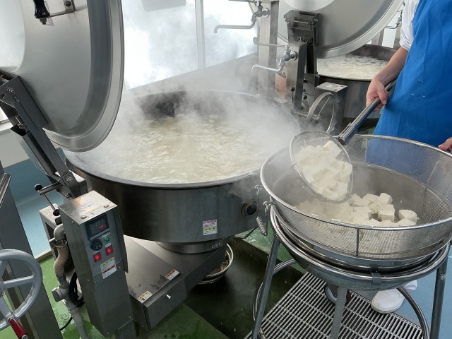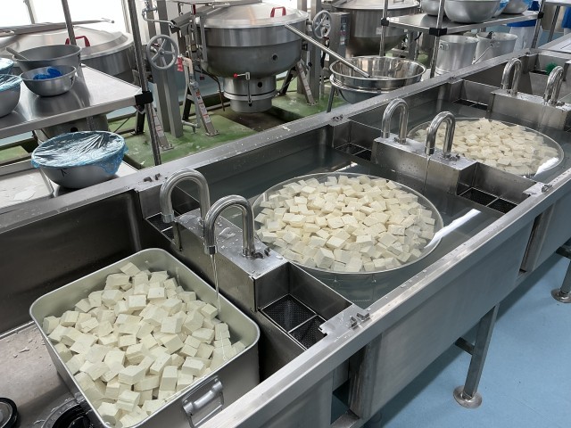 豆腐の五目炒めは、全校分で約70kgの豆腐を使います。豆腐の中心までちゃんと温まるように、豆腐だけで一度ゆでてから五目の具と合わせて作ります。