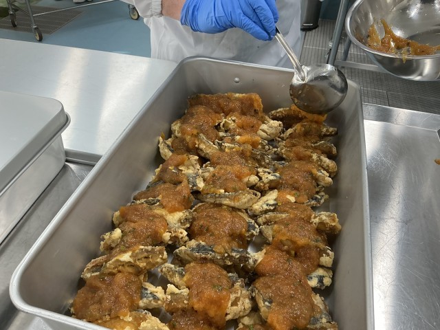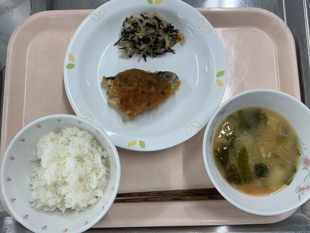 今日のごはんは有機米です。おかずは揚げたさばに大根おろしのタレをかけたさばのおろしかけです。白いごはんがよく進む味付けで、どのクラスもごはんはほとんど残っていなかったです。