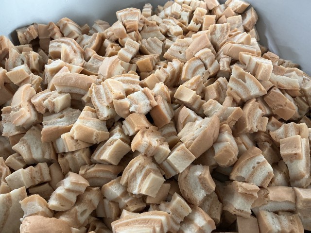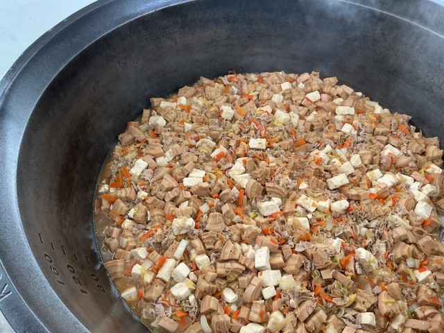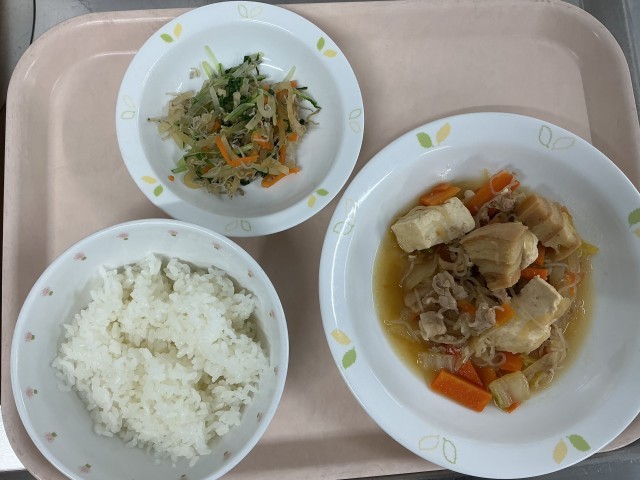今日のすき焼き風煮は、白菜や玉ねぎなどの野菜を、豚肉や豆腐と一緒煮甘辛く煮込んで作りました。車麩が煮汁をよく吸っていておいしくいただけました。