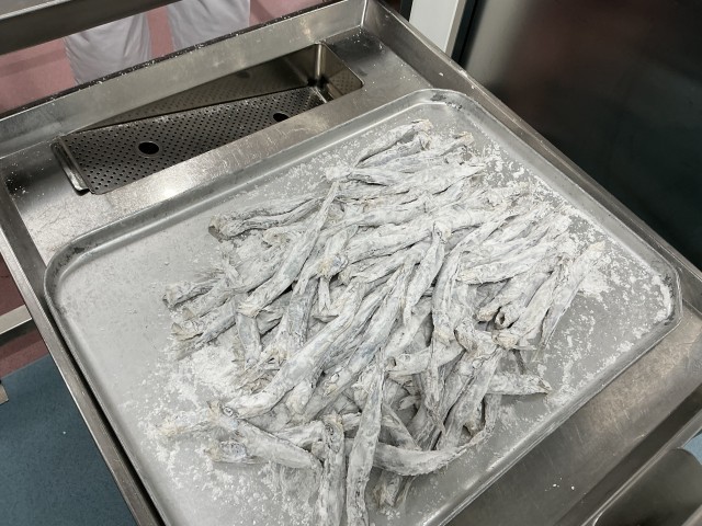 ししゃもの和風マリネは、唐揚げしたししゃもに、野菜と酢や白ワインなどを合わせたマリネ液をからませて作りました。教室で食べるころにはししゃもがいい具合にマリネ液に浸かっていました。