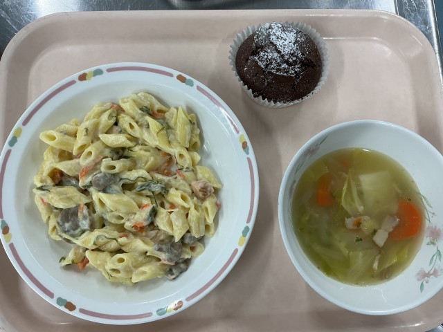今日のガトーショコラは、11月に行った残食調査で、残食の少ない回数で見事1位に輝いた2Dのリクエスト給食です。明日はバレンタインなので、ちょうど皆さんへのバレンタインプレゼントとして今日の献立に取り入れました。チョコレートは使わず、ココアやバター、生クリームなどを使って作りましたが濃厚な味わいのケーキになりました。