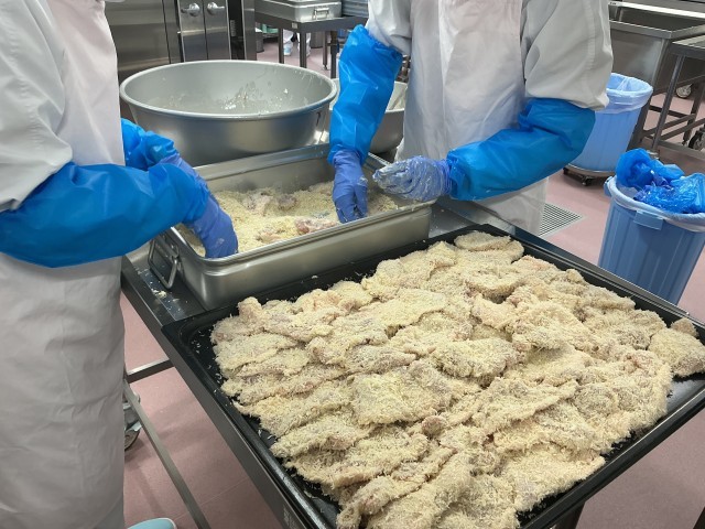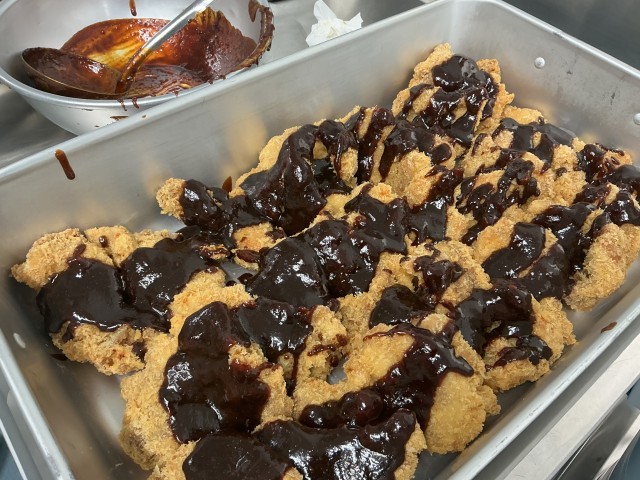 今日の給食は、チキンカツに八丁みそを使ったみそだれをかけたチキンみそカツ丼です。普通のみそは1年程度ねかせてから食べますが、八丁みそは2年以上ねかせます。その分、大豆のうま味がギュッとつまった、深い味わいが特徴です。