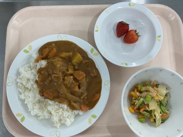 今日から新年度の給食がスタートしました。みなさんに楽しみにしてもらえるようなおいしい給食を作っていきますので、しっかり食べて、学校生活を元気に送ってください。最初はみんなが大好きなカレーライスの献立です。カレーもサラダもいちごもどれもほとんど残っておらず、みんなよく食べてくれていました。この調子がずっと続くといいですね。