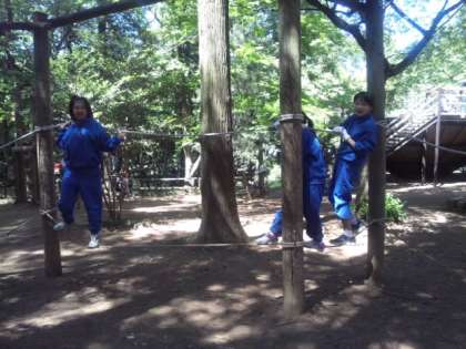 冒険コースの挑戦者たち バランスをとりながら、進んで行きます。