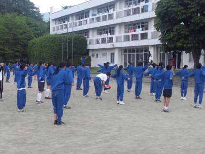 朝の会でをしている後ろにはうっすらと富士山が見えています。が写真には写っていないようです。
