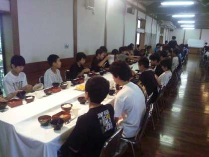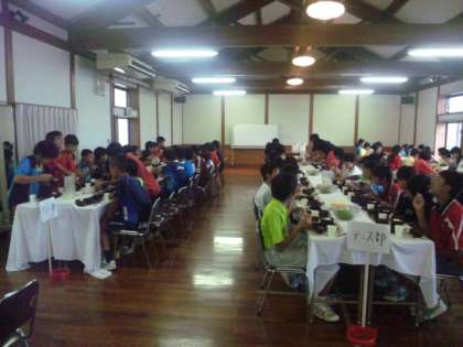 朝食会場で話をしました。昨日と同じく 練習で一つでも成果を上げたところがあるかどうか尋ねました。個人ではあまり手があがりません。部としては?では多くの部で手があがりました。