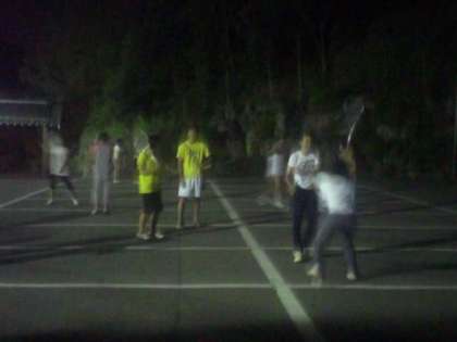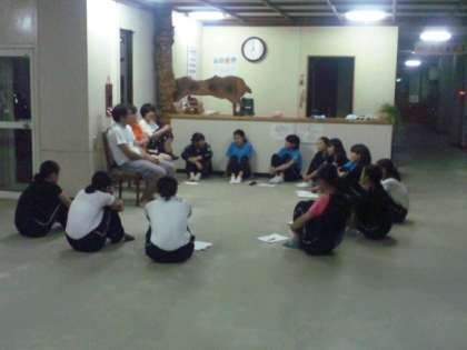 一日の練習の反省会や心構えについて話し合っています。また、外で素振りの練習をしています。