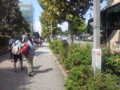 京都でおりる他の中学校と並びながら、八条口を出てバスに乗り込みます。道路にはたくさんの観光バスが待っています。