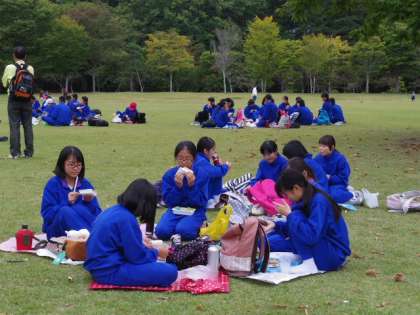 広々とした芝生の河口湖総合公園で昼食です。なぜか雲が広がり天気が心配ですが、家族が作ってくれたお弁当をおいしそうに、ほおばっています。