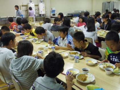 午後6時からは夕食です。メニューはカレーライス。富士山の清掃活動で頑張ったせいでしょう。いただきますの数分後には、おかわりの行列ができていました。